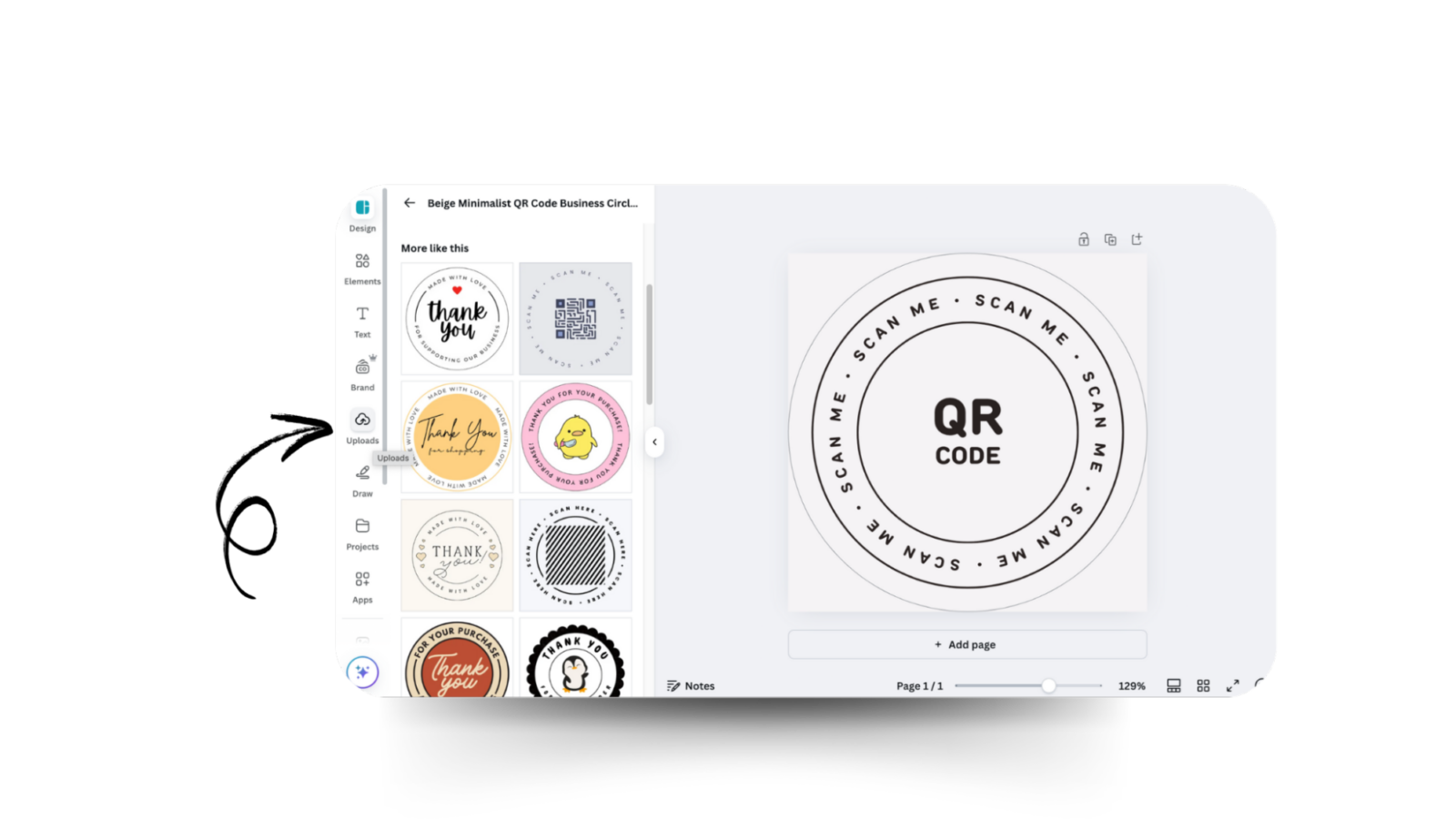 - The next step is to add your QR code to the sticker. Click on the upload option from the left bar at the 5th number. Upload the QR code from your device. Then click on it to add the code to your sticker.
